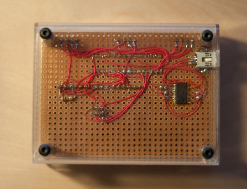 The FTDI chip that I used to provide the USB interface is only available in surface-mount form. There’s a nice evaluation board with the chip and a USB port on it that I’ve used before in other projects, but I didn’t have any sitting around. The prefabricated evaluation board also adds about $20 to a project, where the chip itself and a USB connector can be sourced for a couple of bucks.