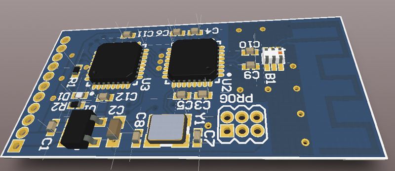 Many small projects seem like they would benefit from low-power, low-bandwidth wireless connectivity. Commercial modules such as the excellent XBee series of devices exist, but are relatively large, expensive, and seem better suited to tinkering with the technology than integration into a finished project. Single-chip RF transceiver solutions are small and inexpensive, but require a fabricated PCB for every design. My goal with this project is to develop an inexpensive and small RF transceiver module that is flexible enough to use in the prototyping stages of a project while not being so general and large that it’s wasteful to use in a finished work.