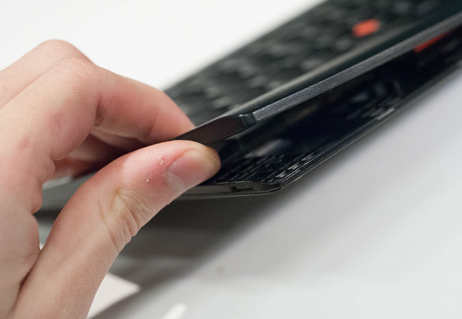 There are only three screws in the entire assembly, and they hold the TrackPoint on to the bottom of the keyboard. Everything else is just press-fit or stuck together. The top frame just pops off. I started in the bottom left corner, and didn’t need any tools other than my figners to start removing it. (If yours is tight, a plastic spudger might help).